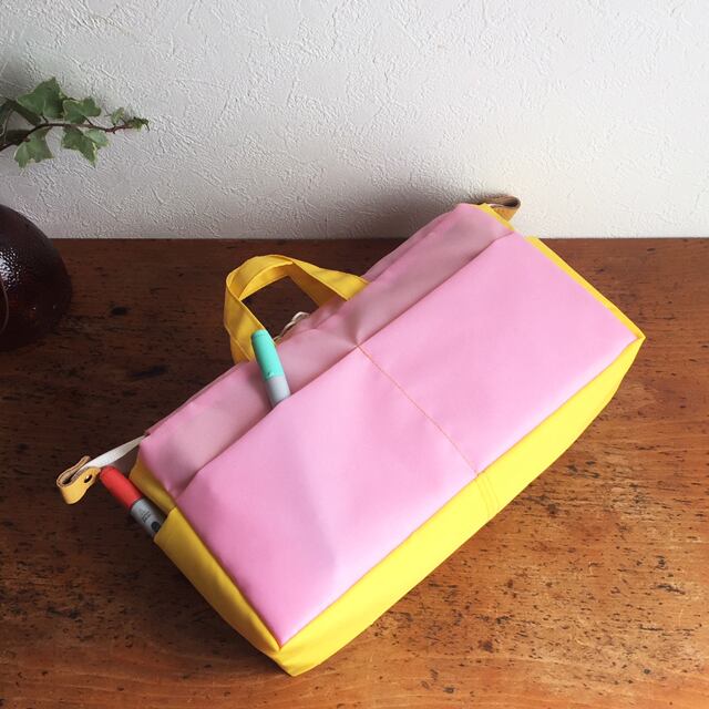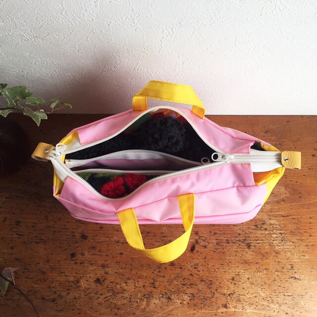 メインのバッグの中で転がってもいいようにファスナー付き。中はファスナー仕切りとポケット。外にもぐるりとポケットをつけます。ステッチ1本でカンタンに自分仕様にポケットサイズをカスタマイズ可能。