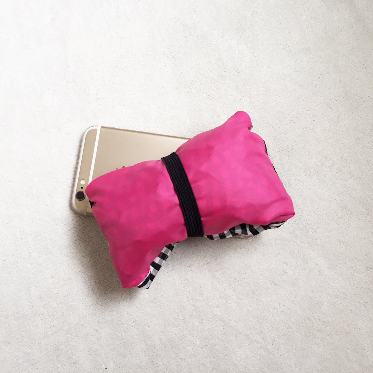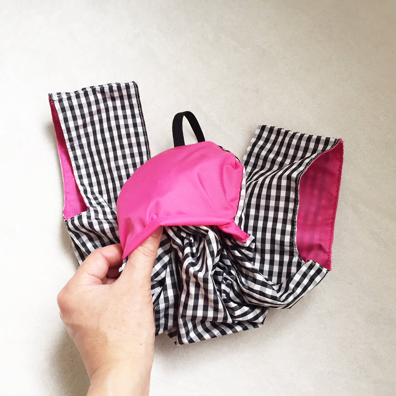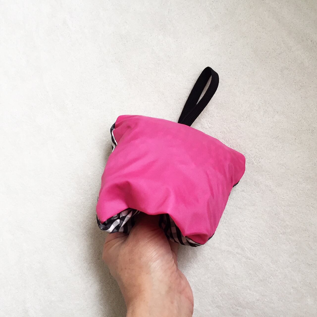 スナップボタンなど副資材が不要な方法で、と、ポケットに仕込んだゴムでまとめることができるように考えました。